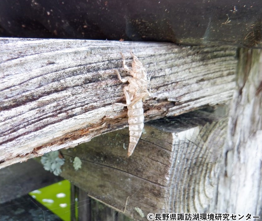 諏訪湖環境研究センターでは、諏訪湖のメガネサナエの生息状況や、環境による影響などを把握するため、諏訪湖の桟橋でメガネサナエの羽化殻(幼虫が羽化した後に残る脱皮殻)の調査を、メガネサナエが繁殖行動を行う河川で成虫のモニタリング調査を行っています。なお、これまで調査を行った2019年から2024年の期間においては、諏訪湖のメガネサナエの減少は確認されませんでした。また、羽化殻の調査結果を地点ごとに比較したところ、近年諏訪湖で大量繁茂している水草「ヒシ」の繁茂が少ない場所では、メガネサナエの羽化殻の割合が、他のトンボの羽化殻の割合に比べて多いことがわかってきました。なぜこのような結果になったのか、詳細はわかっていませんが、今後の調査で要因がわかれば、メガネサナエの保全に役立てることができるかもしれません。