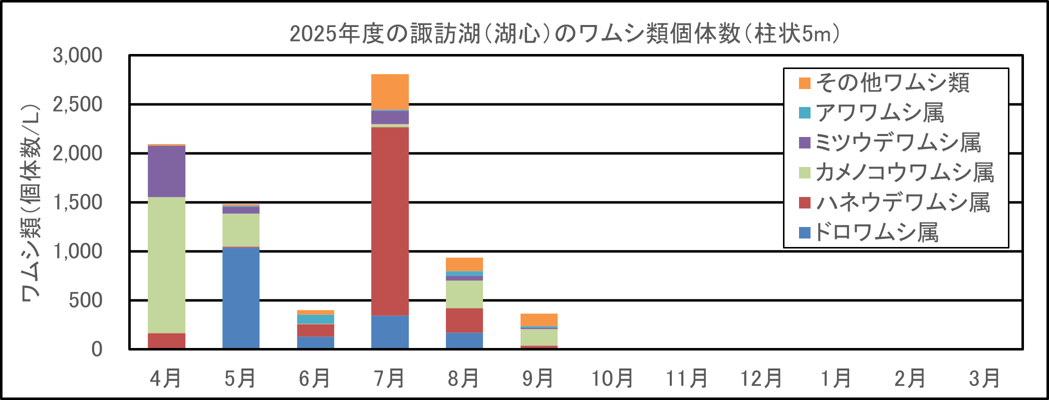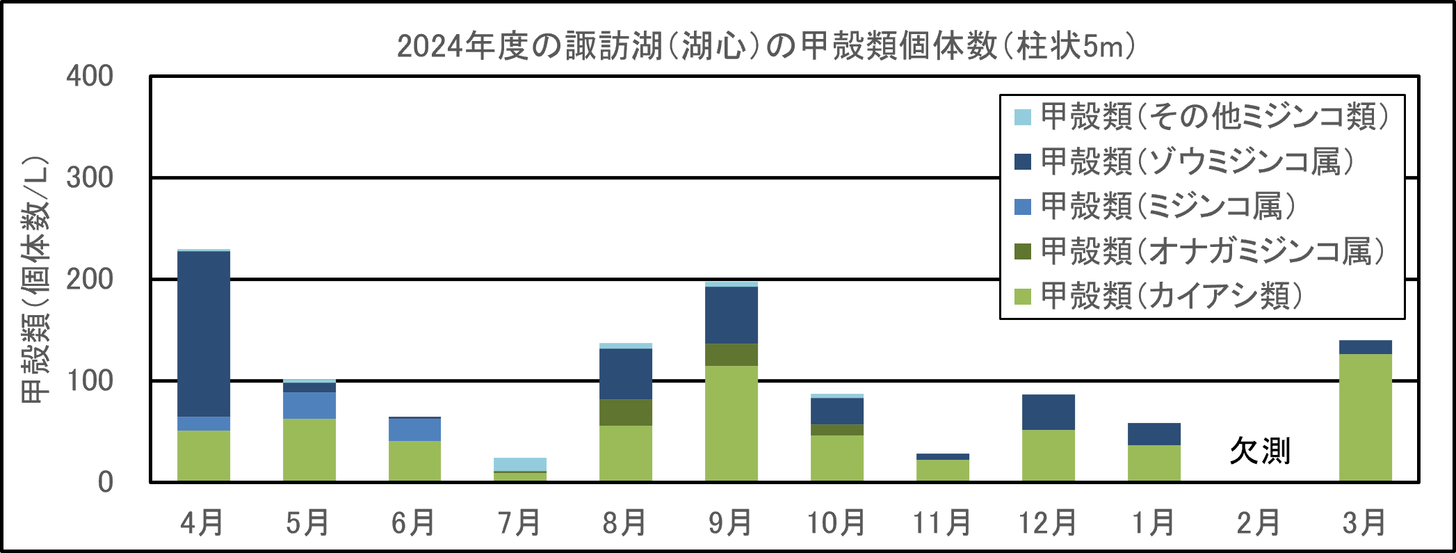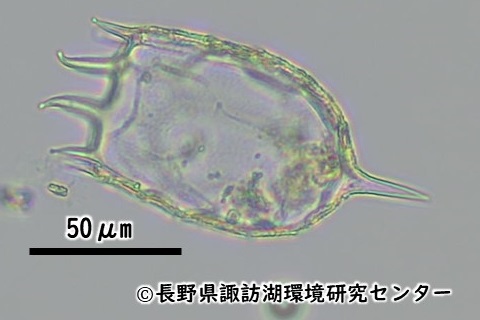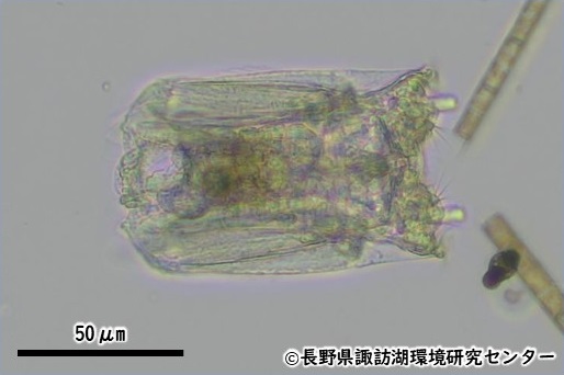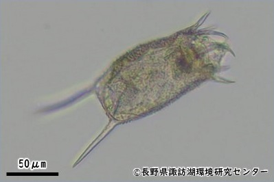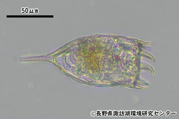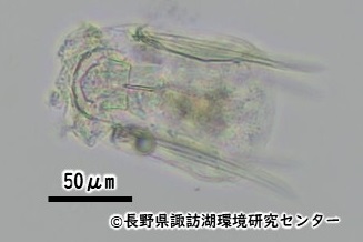 諏訪湖湖心で水深5mまでの水を柱上に採水し、NXXX25(目合41μm)(2024年度まではNXX25(目合63μm))のプランクトンネットでろ過した。濃縮したサンプルを検鏡・計数し、湖水1L当たりの個体数を算出した。
