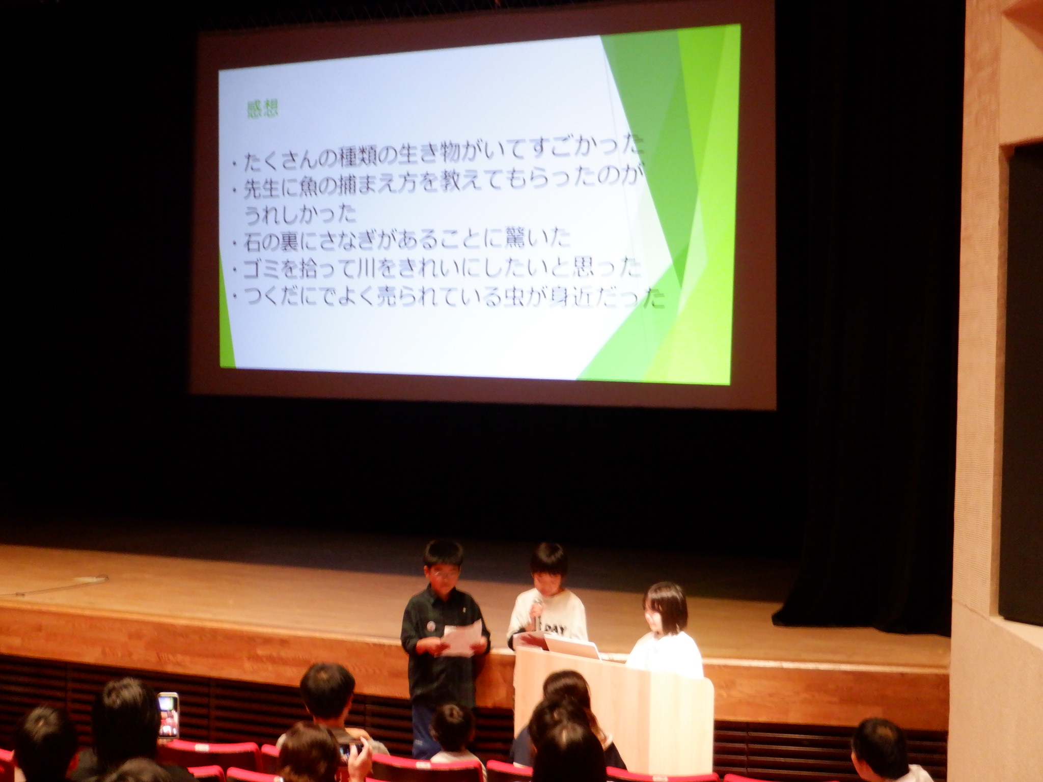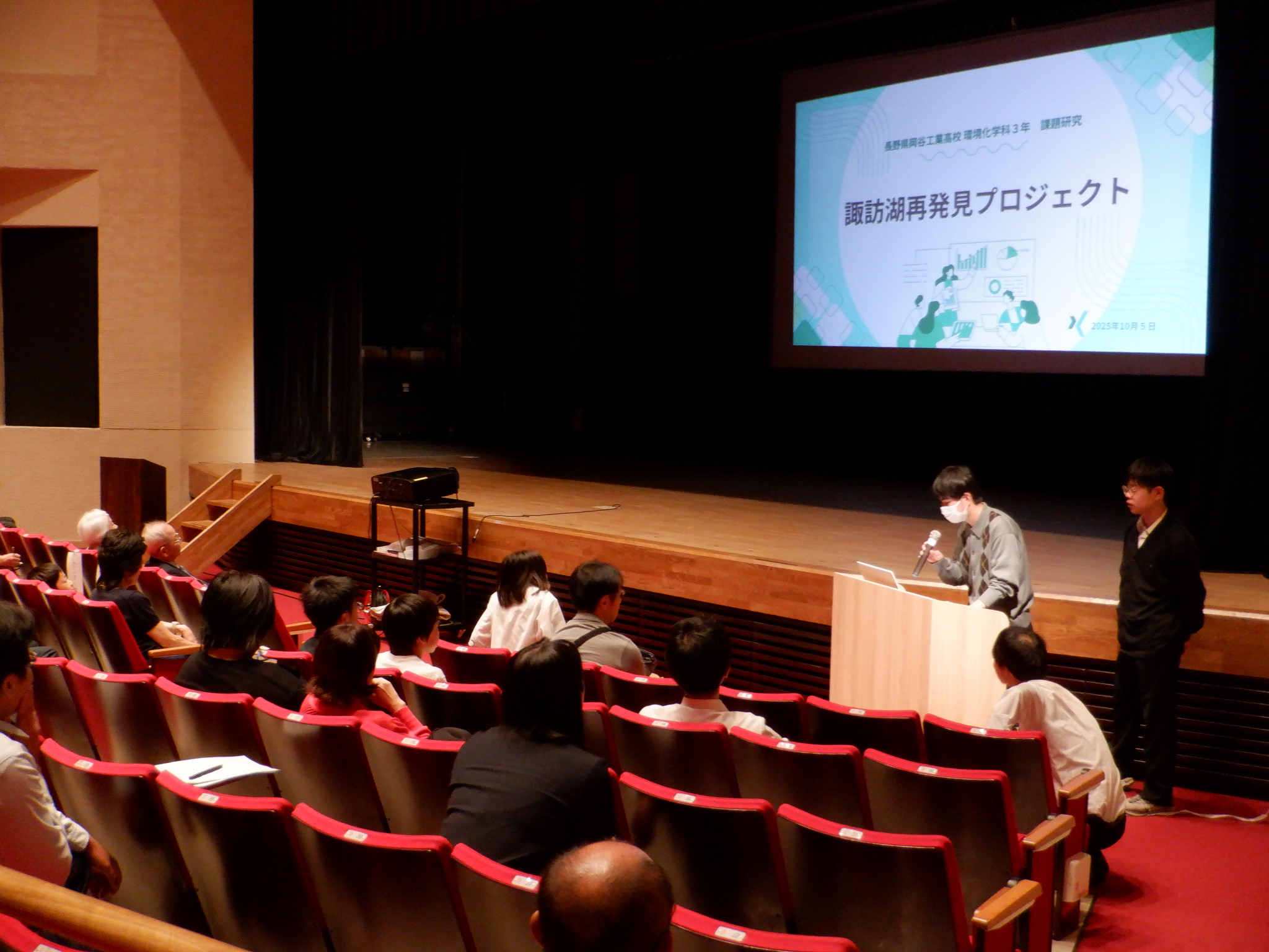 最後に、下諏訪南小学校クラブ活動「水辺生物観察クラブ」参加の児童の皆さんによる発表、岡谷工業高校環境化学科3年生による課題研究の発表をしていただきました。