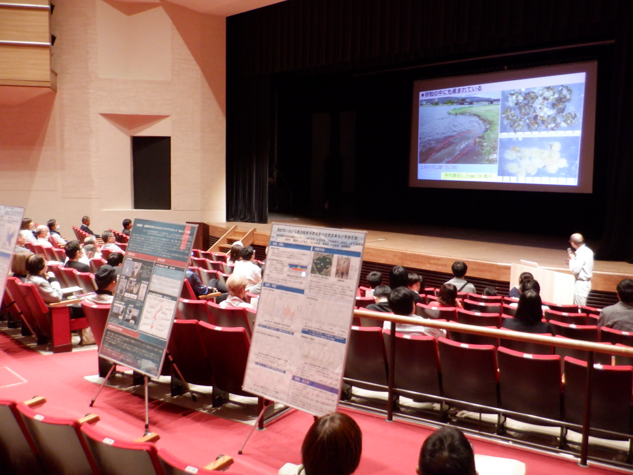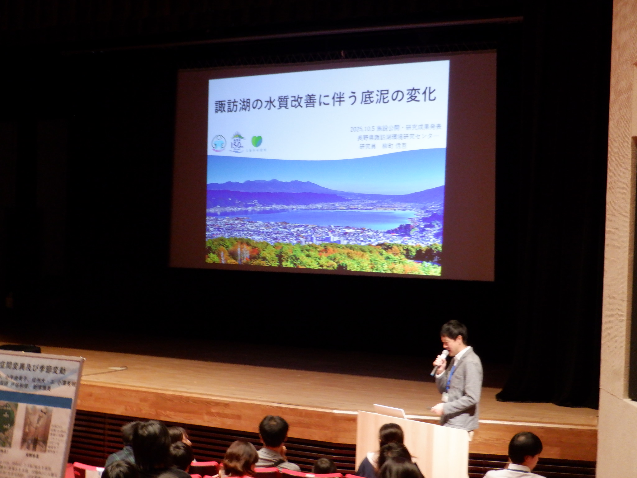 続いて、センター研究員2名による発表を行いました。柳生研究員は「諏訪湖の湖岸で産卵された卵のナゾを追う」、柳町研究員は「諏訪湖の水質改善に伴う底質の変化」と題し発表しました。