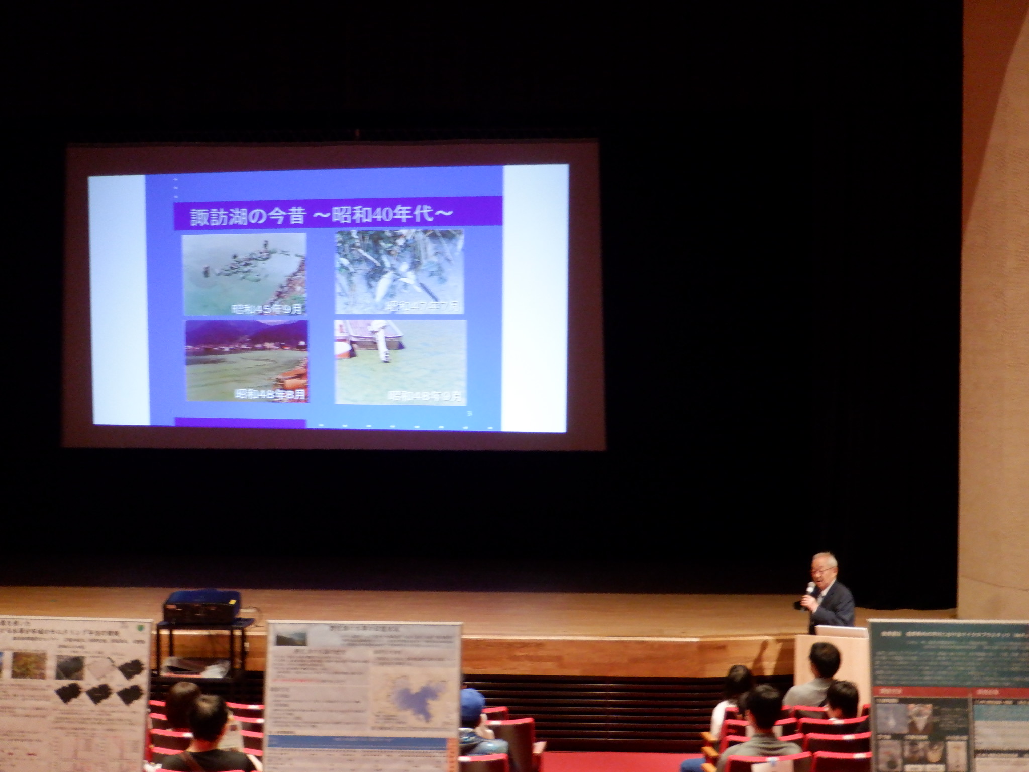はじめに、信州大学名誉教授(諏訪湖創生ビジョン推進会議会長)沖野外輝夫様から「諏訪湖環境研究センターに期待すること」と題して、沖野様がこれまで諏訪湖の環境改善に向け、取り組まれてきた内容を交えてお話いただきました。