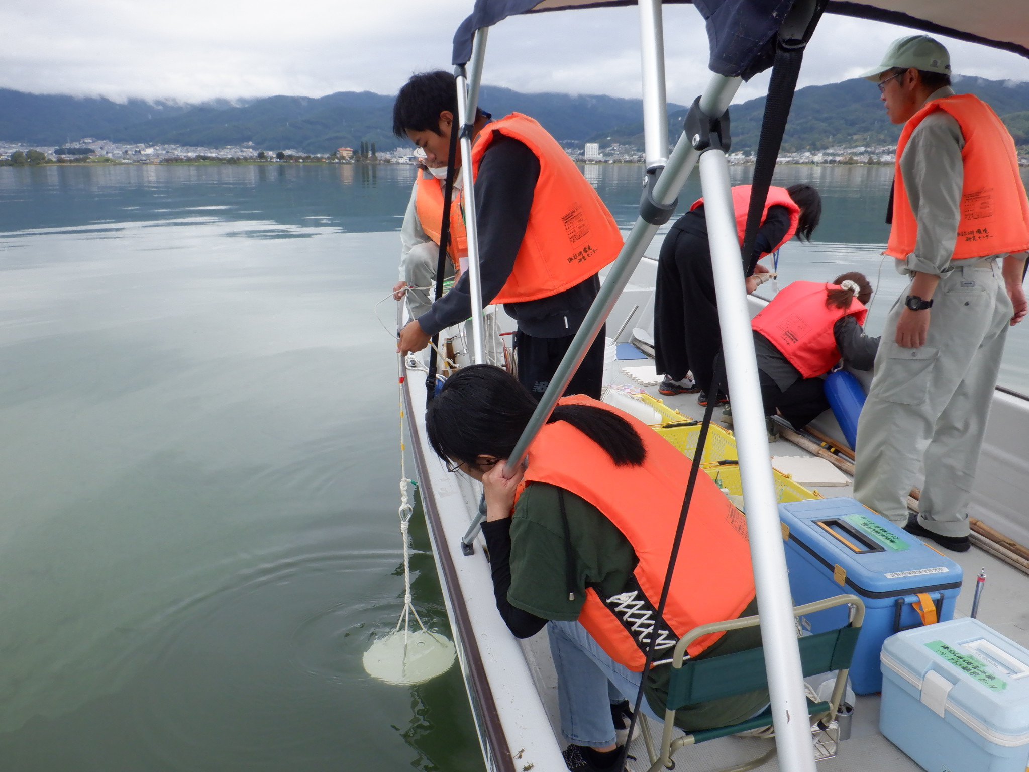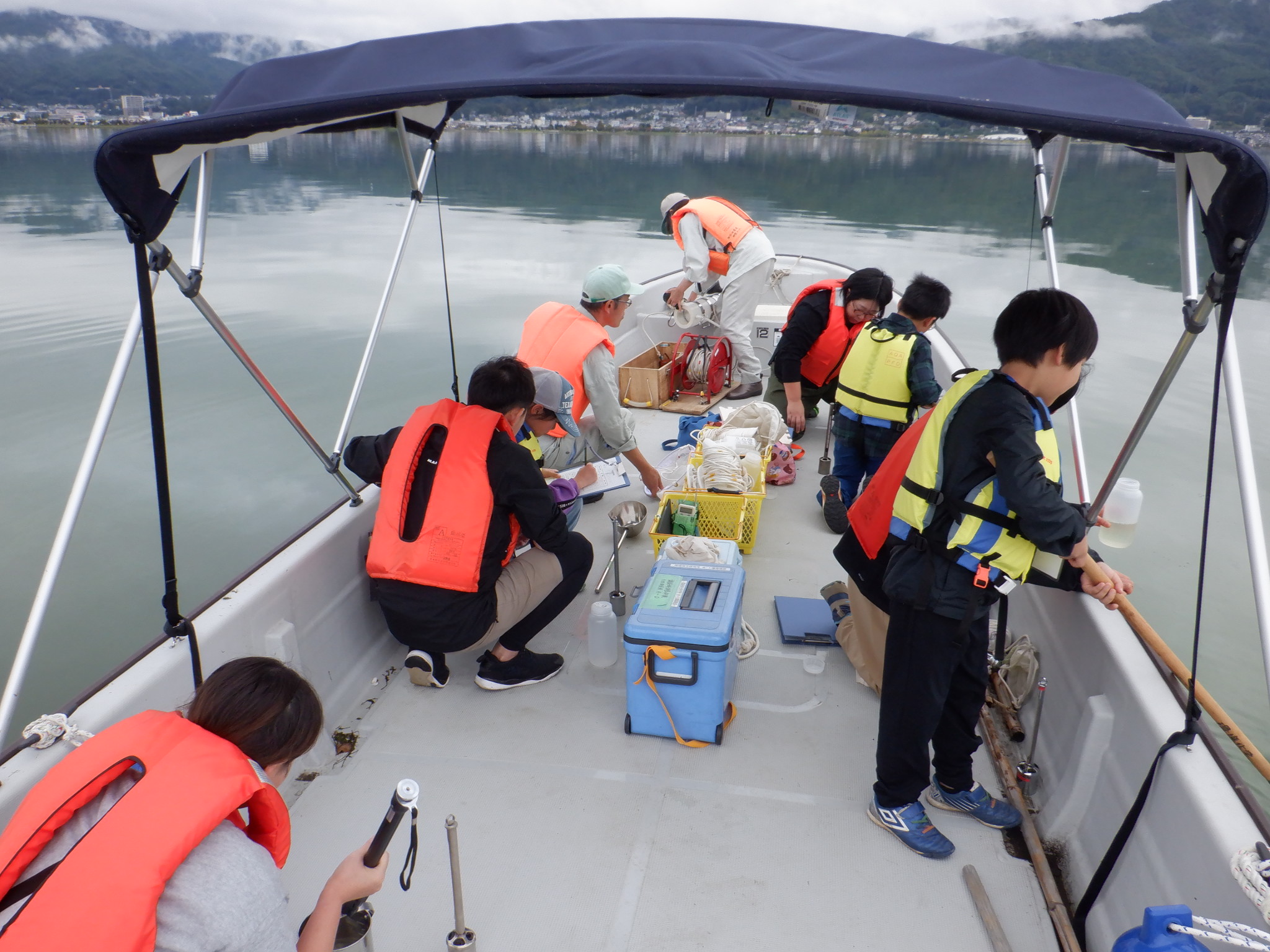 センターが所有する調査船「かんけん1号」に乗船していただき、諏訪湖の中心(湖心)で採水や透明度の測定、プランクトンの採取を行っていただきました。