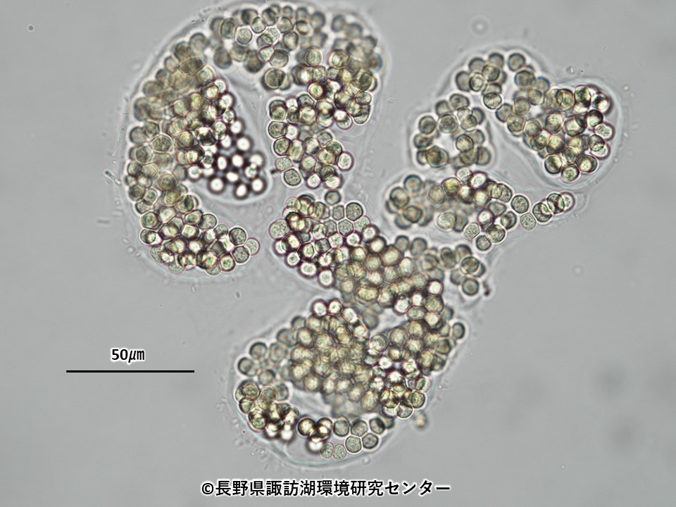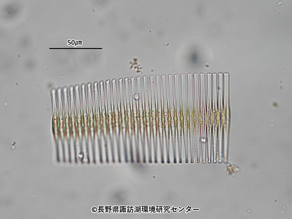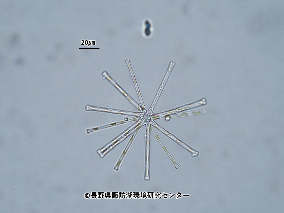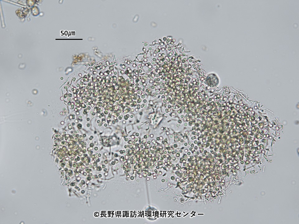 諏訪湖湖心で採水した水にルゴール液を加え、固定した。セディメントチャンバーに固定した試料を沈降させ、顕微鏡で検鏡・計数し、湖水1mL当たりの細胞数を算出※5した。